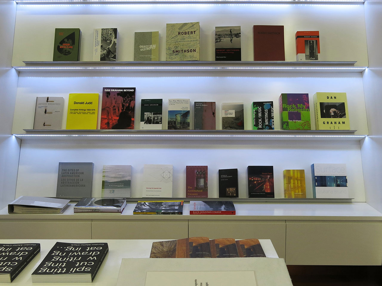 The bookshop contains a broad selection of artists' own writings and interviews, another section on art theory and history, as well as a number of highly diverse publications that are sometimes grouped together in small thematic clusters. Established artists and authors rub shoulders with others that are less well known; major publishers share shelves with lesser sized publishing projects or even very small publishers.
